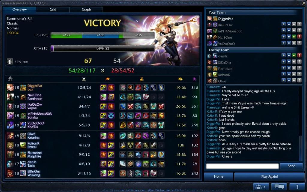 This was a fun one. Our top was kinda derpy but their Taric had internet issues for a fair amount of the game. Vayne went beast mode and I got to see what a fully loaded Lux felt like. What the other team lacked in kills they made up for in pure offense so they really kept us on our toes. We had to chase them off the Nexus once. Also found out that Lux has a pretty crazy poke game keeping them out of the base while teammates handled creep waves. Didn't gain much if any kills during but it sure as hell made them think twice about pushing in.