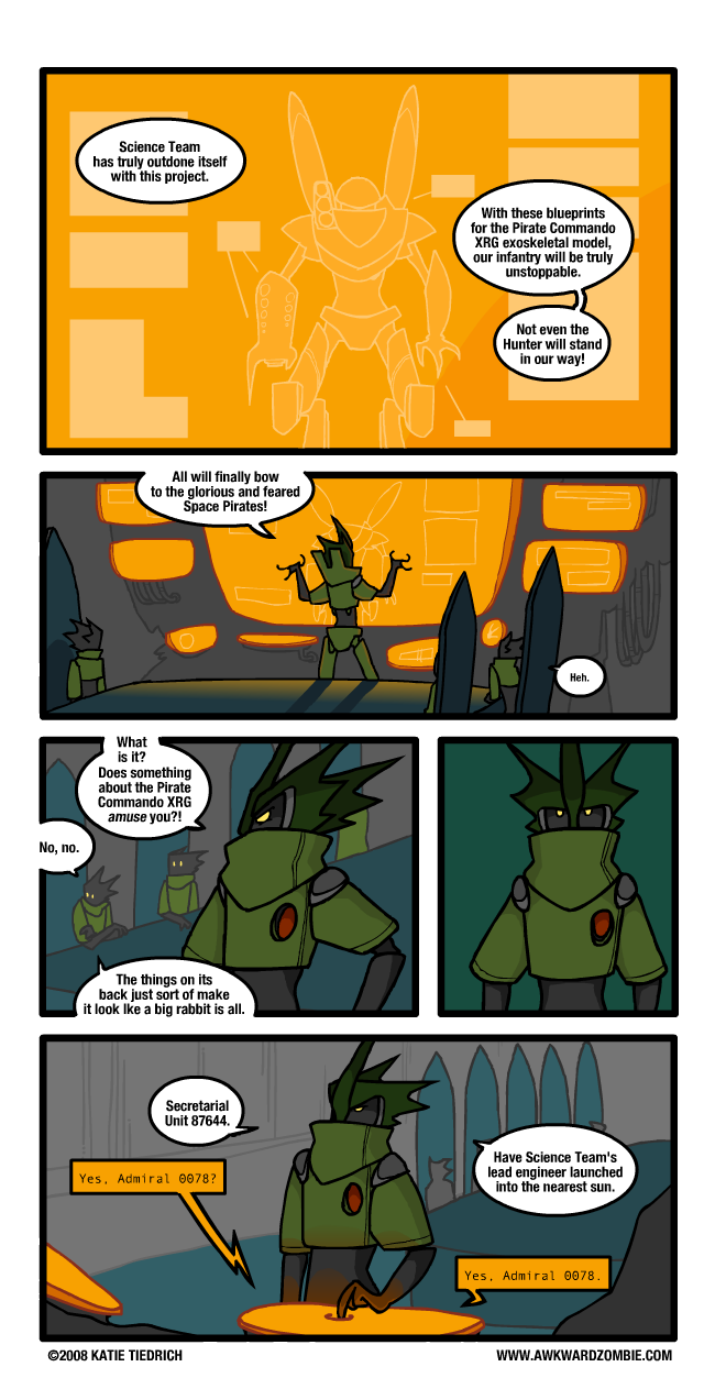 In an unrelated story, it's also really hard to anthropomorphize them Pirates. They're all shrieky and hunched and alien and then you read their datalogs and they sound like they were written by a species with, I don't know, opposable thumbs. I dread the day I make myself draw a member of the Spoken Of Only In Whispers Science Team, and it's going to be a lobster-clawed mutant in a lab coat and glasses.