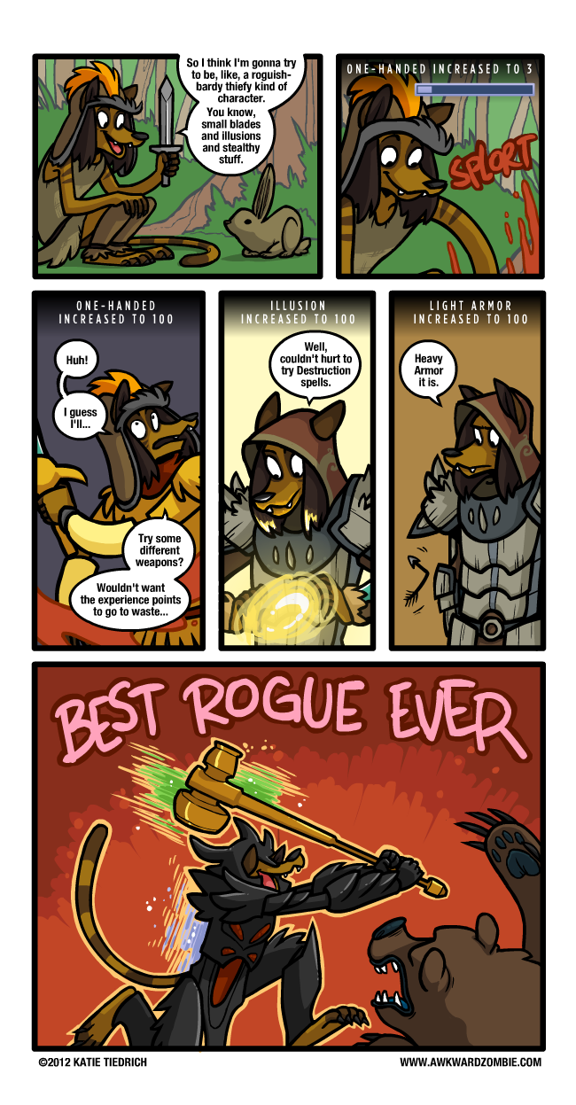 mentioned, I hate the idea of wasting potential EXP. In a game like Fire Emblem it means rounding out all my units' abilities -- in a game like Skyrim, with a far more distant level-cap, it means leaving behind the \"important\" skills that I maxed out first in favor of literally everything else.