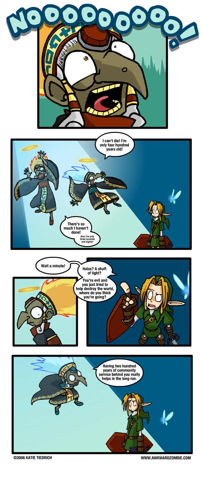 After killing Twinrova, Koume and Kotake seem to ascend to an illuminated higher plane, instead of getting sucked into a fiery vortex (which would probably make more sense, given their inherent nefarity). I don't know, maybe there's another side to them we've never seen--something to balance out and perhaps even outweigh the evil. Maybe, when the two are not smiting innocents or flying around in dastardly circles, they're rescuing puppies from burning buildings or donating to charity.