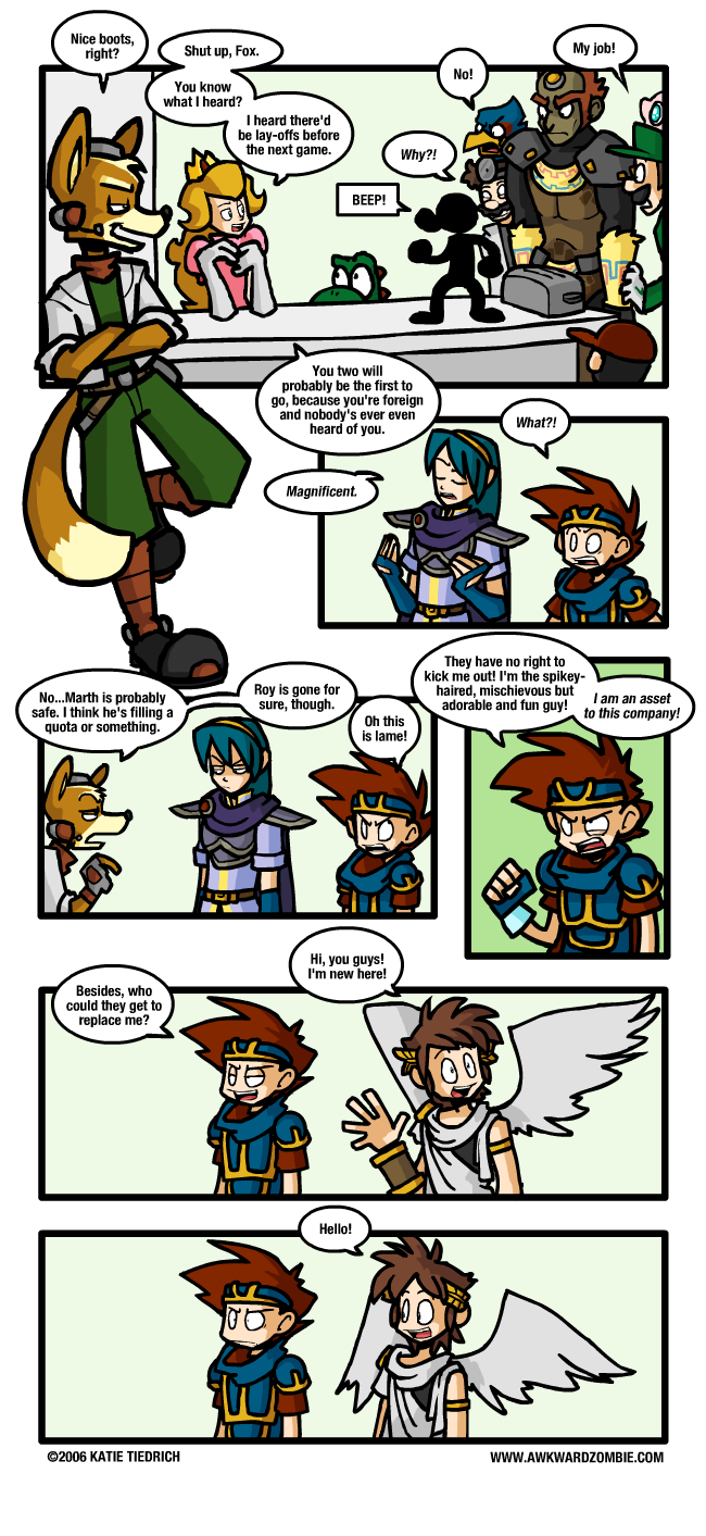 shakes me to my very core, 'cause I sometimes like to fight using Roy on some Melee occasions... Oh, yeah, and because of the whole comic thing. Oh, the woes of using someone else's characters to make a profit! Anyway, if any of my favorite characters to make fun of are left out, I just don't know what I'll do. The best thing is to just wait for the game to come out so I can decide then, so shut up and stop asking me. However...I thought Pit's character model looked remarkably like Roy's. Maybe it's because he's short.