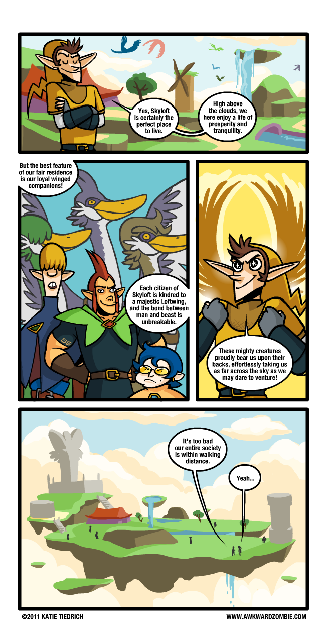 When you get introduced to the game, it seems really, really cool to have a giant pet bird to fly around on. Then you actually start flying around, and you realize that the only place really worth flying to is the one you started at because there is nothing else out there. Link has an excuse to go to the desolate corners of everywhere because he is on an ADVENTURE, but the average citizen doesn't have much reason to leave home.