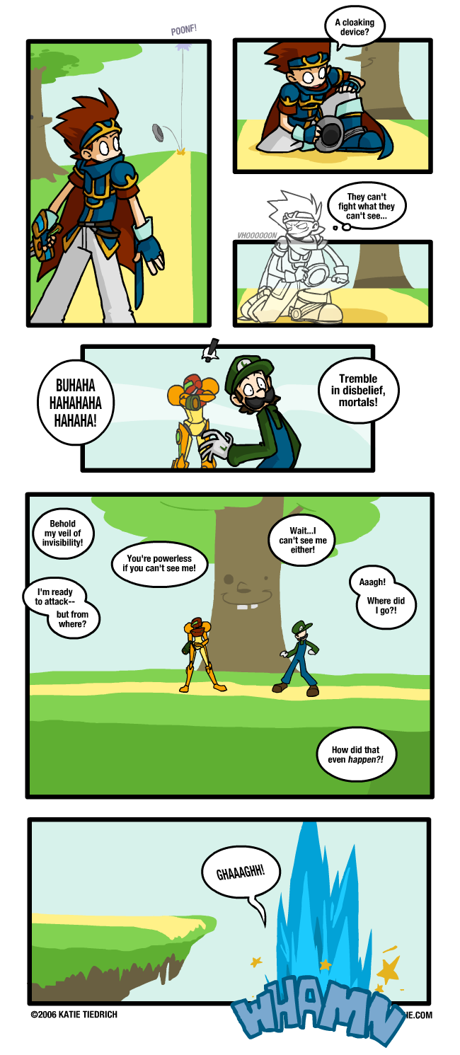 Okay I hate hate hate the cloaking device. Being invisible is only useful for about one second because the people I'm fighting can find me, but I always lose track of where I am and I end up sprinting off cliffs by accident. Woe.